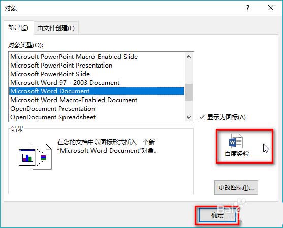2、点击"显示为图标",接着点击"更改图标",输入新文档的名称,点击"确定"。