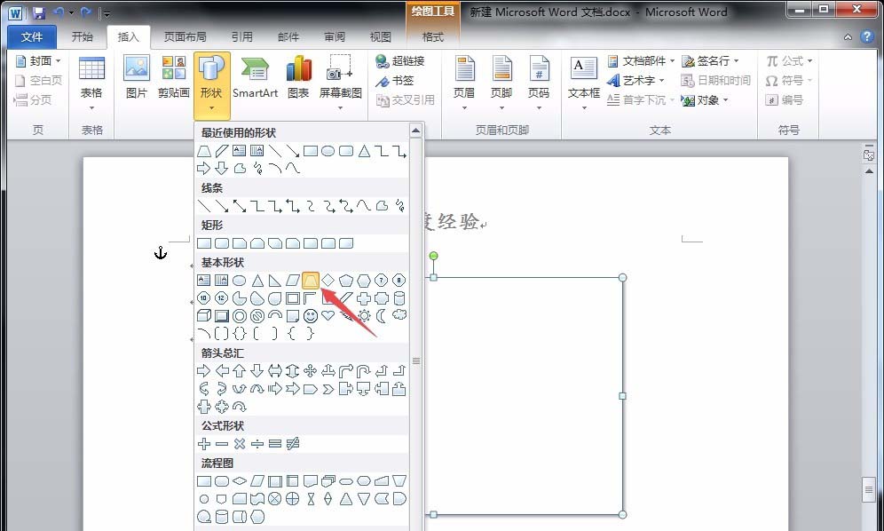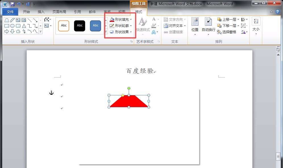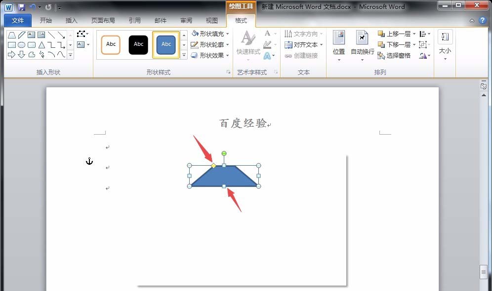 3、下面,点击"插入"菜单下的"形状"-"梯形",绘制出一个梯形,并用鼠标调整其斜边角度,以及填充颜色。