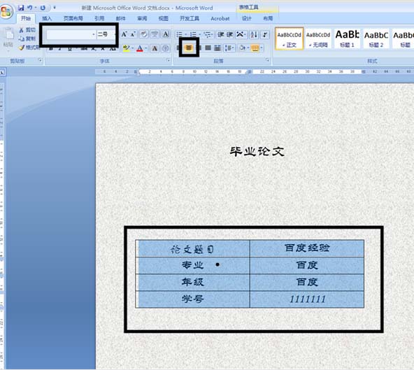5、表格设置完毕后,我们设置好表格内容的字体和字号后,在表格内编写论文的标题,专业,学号等封面内容,编写完毕后点击上方的居中按钮。