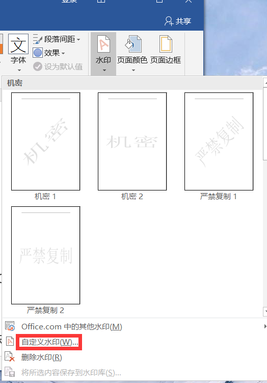 4、点击水印后,选择自定义水印。