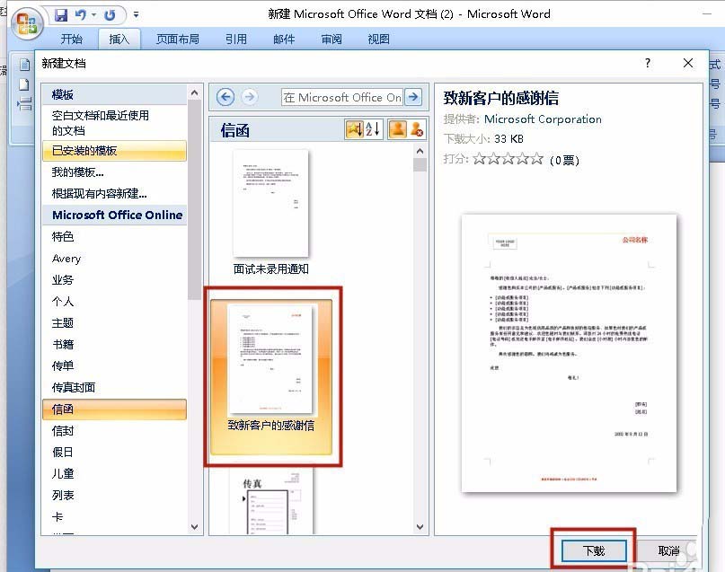 3、选择"致新客户的感谢信",在这里,我们看到还可以创建其它很多文件,如:面试未录用的通知、传真等,挺方便的。
