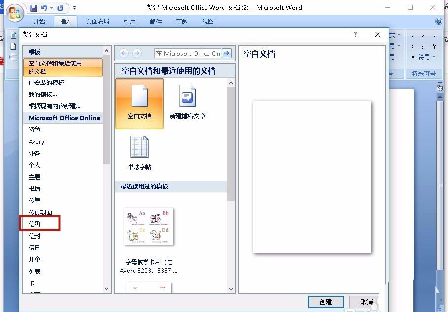 2、弹出"新建文档"的选项,在这里,我们选择"信函"。