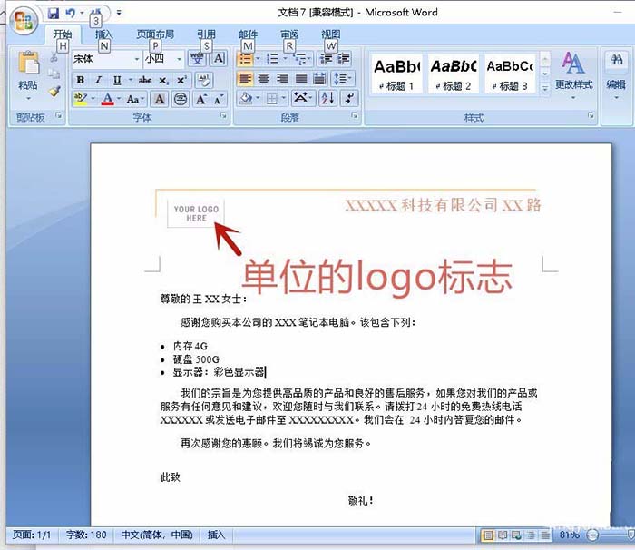 5、根据自己的要求,在【】内输入文字,如图的箭头所指处可放单位的logo标志。
