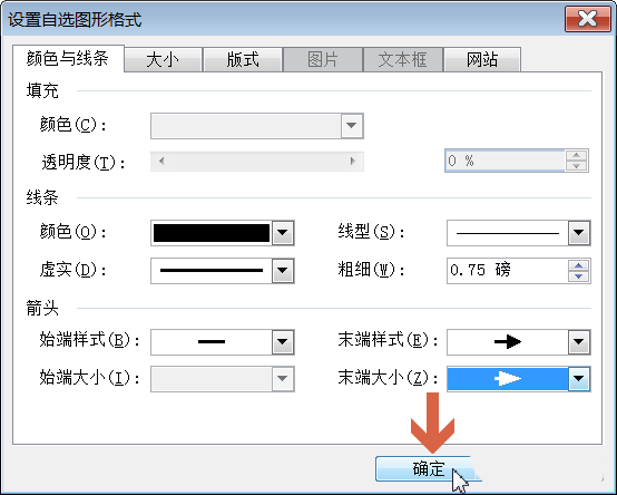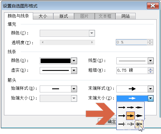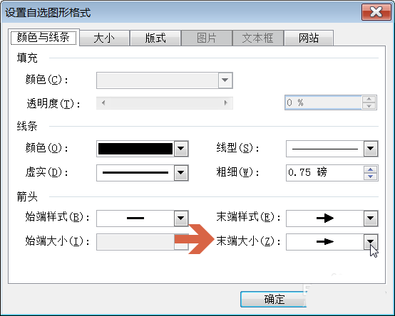 4、在打开的设置自选图形格式对话框中点击【末端大小】下拉框。