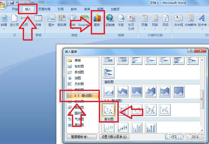 1、打开word程序,在菜单栏插入菜单中选择图表图标,鼠标左键点击一下,页面弹出一个对话框,选择左侧的X Y(散点图),可以看到右侧有5种散点图的样式,我们选择第一种样式作为实验。鼠标左键点击确定按钮进入下一步。