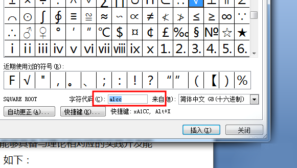 6、如果觉得这样不好找,也可以在"字符代码"中输入"A1CC"。