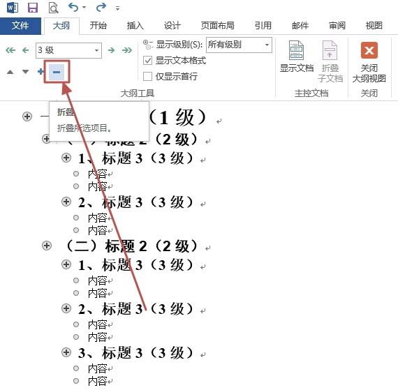2、如果只折叠某一标题下的子标题或正文,请把光标移到该标题上,单击"折叠"按钮。单击一次,折叠最低的一级。