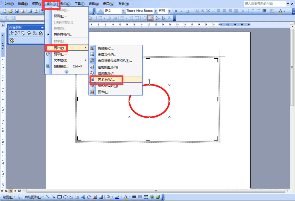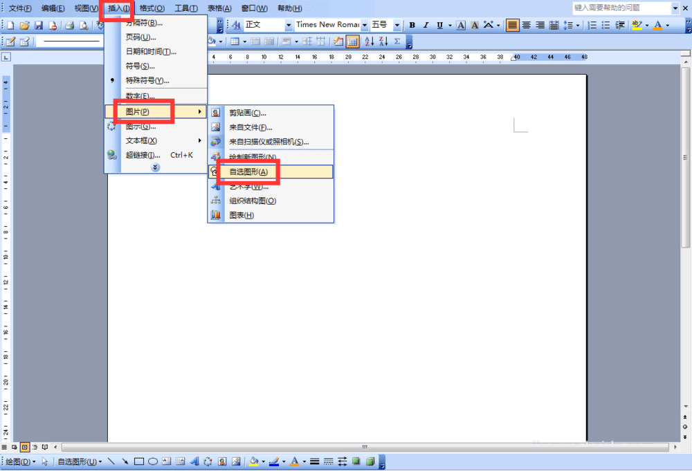 1、首先在Word的菜单栏→【插入】→"图片"→"自选图形"。