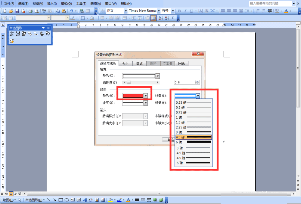 5、【设置自选图形格式】的窗口,在"颜色与线条"这一项,颜色选择为红色,线型有很多种供自己选择,4.5磅粗细正好,点击"确定"即可。