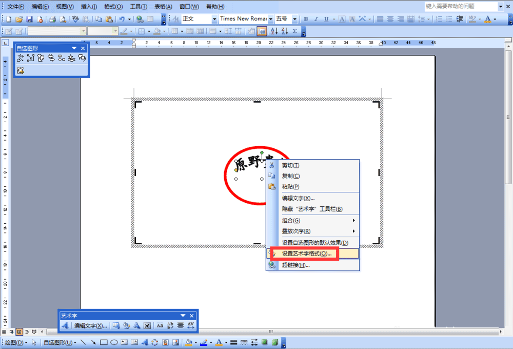 9、鼠标右键点击"原野贵树"文字,选择"设置艺术字格式"。