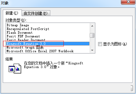 2、在对象类型中找到"Kingsoft Equation 3.0"命令,点击选中后确定即可在编辑器弹出一个公式工具栏(活动窗口),利用这些工具我们可以创建各式各样的公式和符号: