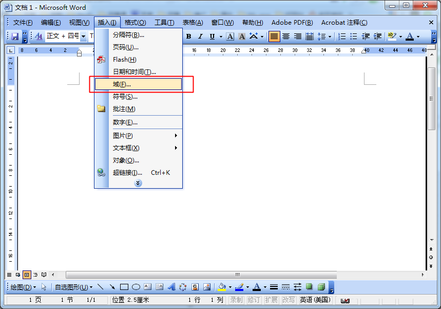 在"菜单栏"中找到"插入"选项,在下拉菜单中点击"域"命令: