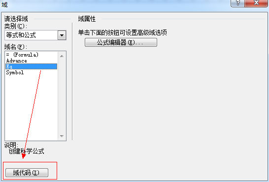 在弹出的域属性中,在类别选项中我们下拉找到"等式和公式",选择后在域名选项中出现四个选项,