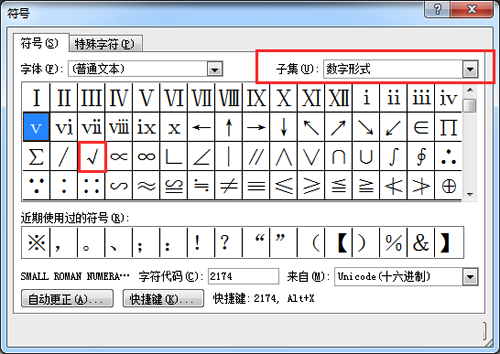 点击子集下拉三角,选择"数字形式",选中"√",点击插入。