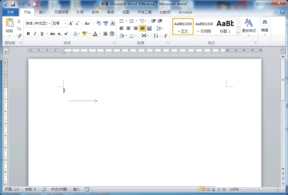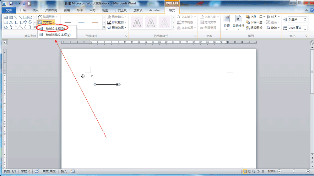 2、当鼠标箭头变成黑色十字时在word空白处拖动画一个箭头。