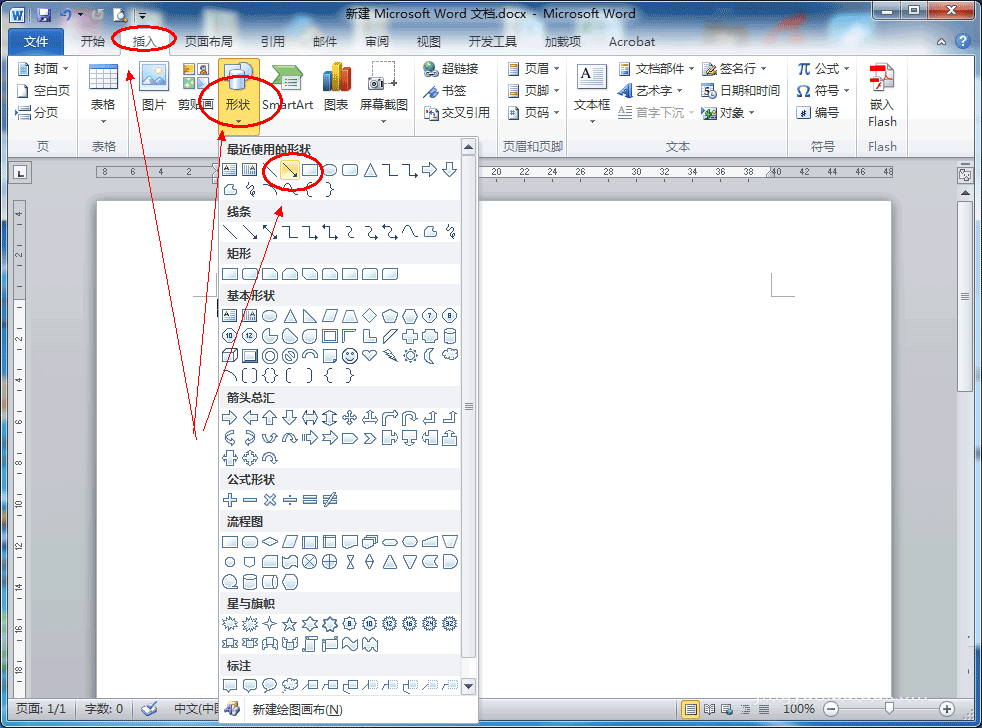 1、怎么在箭头上写字呢,跟着步骤尝试操作一遍就会了。新建一个word文件,依次点击菜单项插入--形状,在下拉的形状菜单中,选择箭头。