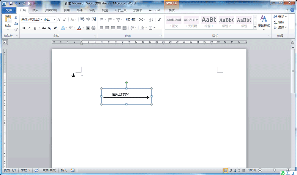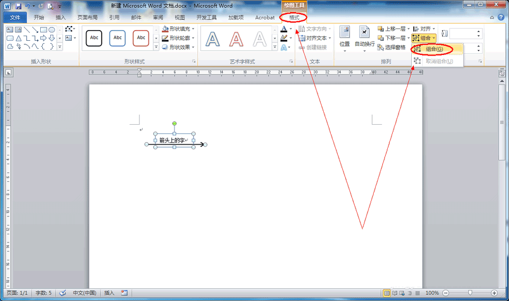 11、按住Ctrl键的同时选择箭头和文本框,然后点击绘图工具格式中的组合命令, 将两个形状绑定在一起,这样两个形状就可以在word中一起移动了。