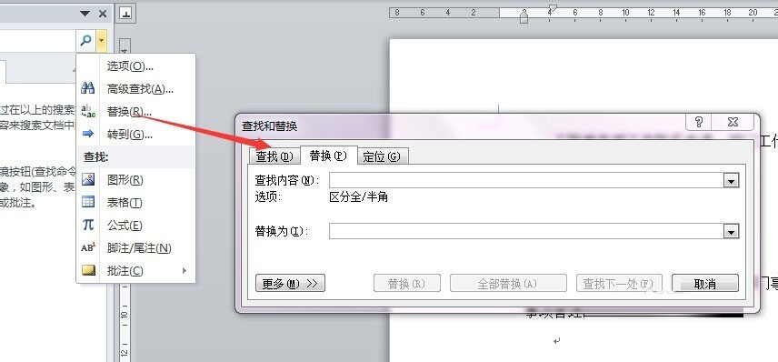 4、打开下拉框后,选择"替换",如图:或者点击"开始",然后在"编辑"组,找到"替换"按钮