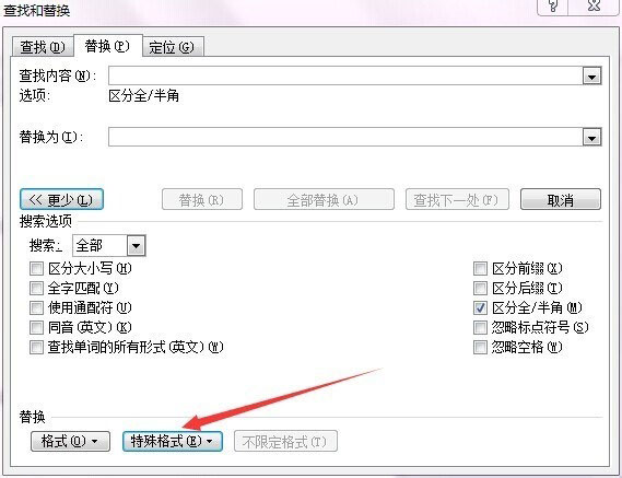 6、将光标移动到下部,然后单击"特殊格式"按钮,