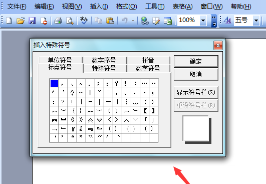 4、点击特殊符号选项,弹出插入特殊符号对话框,如图所示: