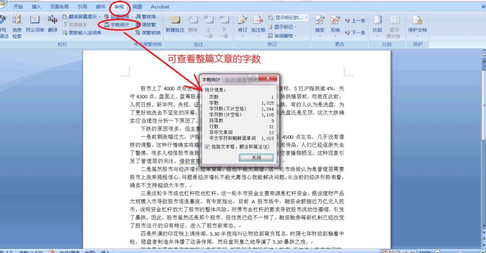 2、点击word文档中菜单栏上的"查阅"----"字数统计",即会弹出"字数统计"窗口,这时我们看到的是整篇文章的很多信息,如页数、段落数、字数等等。