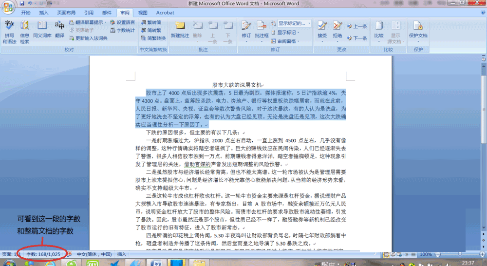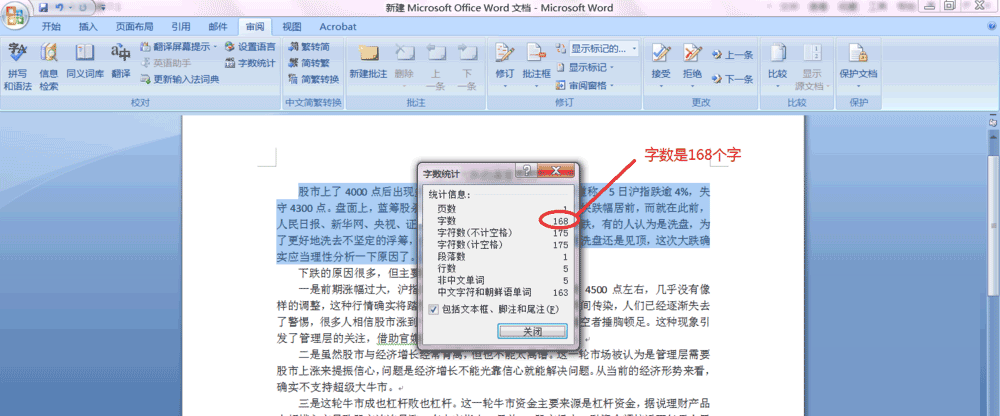 跟看整篇文章的字数一样,我们在文档中选中某一段落,再点击word中菜单栏的"查阅"---"字数统计",即可弹出"字数统计"窗口,我们即可看到段落的字数,如下图,图中段落的字数是168个字