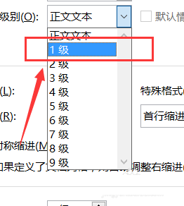 3、单击"大纲级别"下拉选项,选择级别"1级"