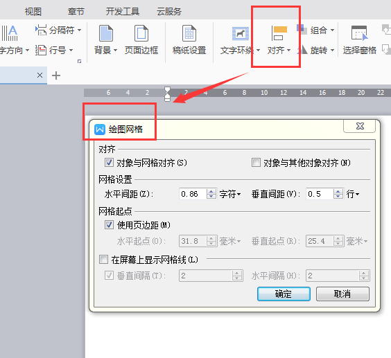 1、打开word 界面,在画图开始前要把画图的参数调整好,然后在进行画图开始画图,首先在【页面布局】鼠标点击在下方的工具栏可以看到【对齐】的选项栏,鼠标在点击可以看到【对齐】的工具栏下有一个【绘图网格】点击 如图提示