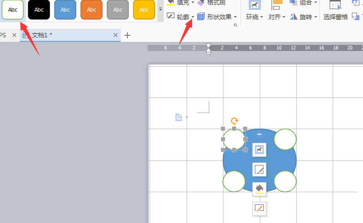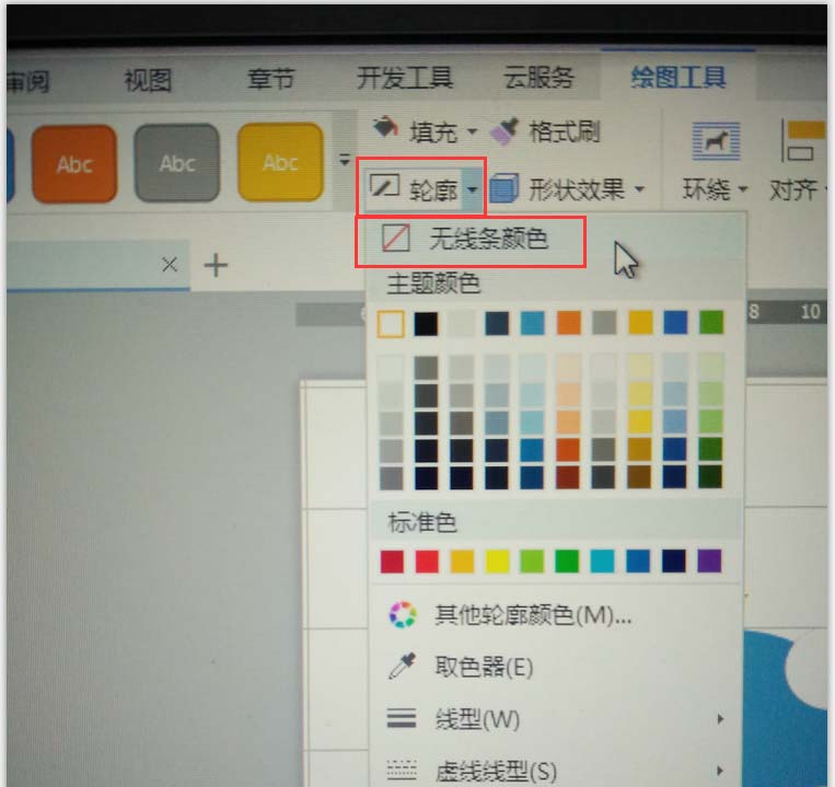 8、做好以上的步骤时基本图形的大概已经出来,但是还是可以看到小圆四周的虚线,这时在【轮廓】里选择【无线条颜色】,选中四个小圆这时小圆四周的虚线也就隐藏,大圆的虚线也安装这样的方法去调整。