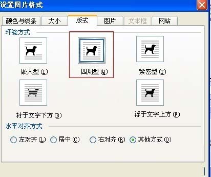 7、在弹出的选框中,我们选择版式,会看到有几种环绕的方式,我们点击四周型