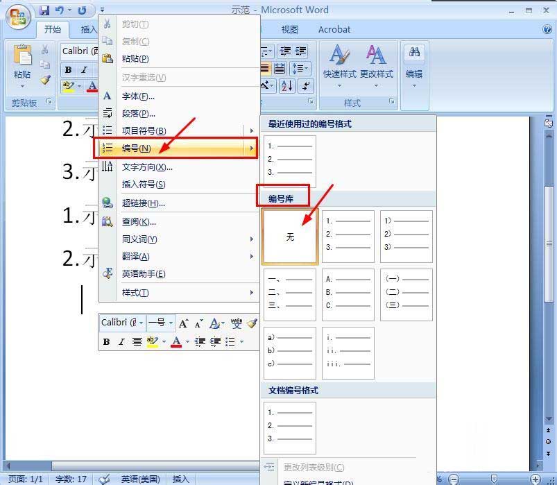 6、当你想停止输入编号时,按右键,选择"编号",在弹出的"编号库"中,选择"无"即可。