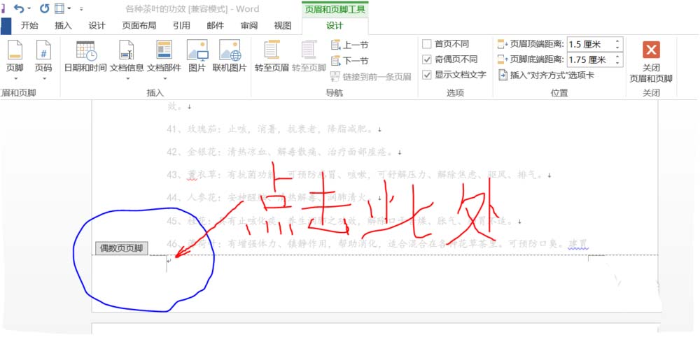 3、鼠标滚至任一偶数页脚(word有标示),鼠标点击页脚激活编辑。