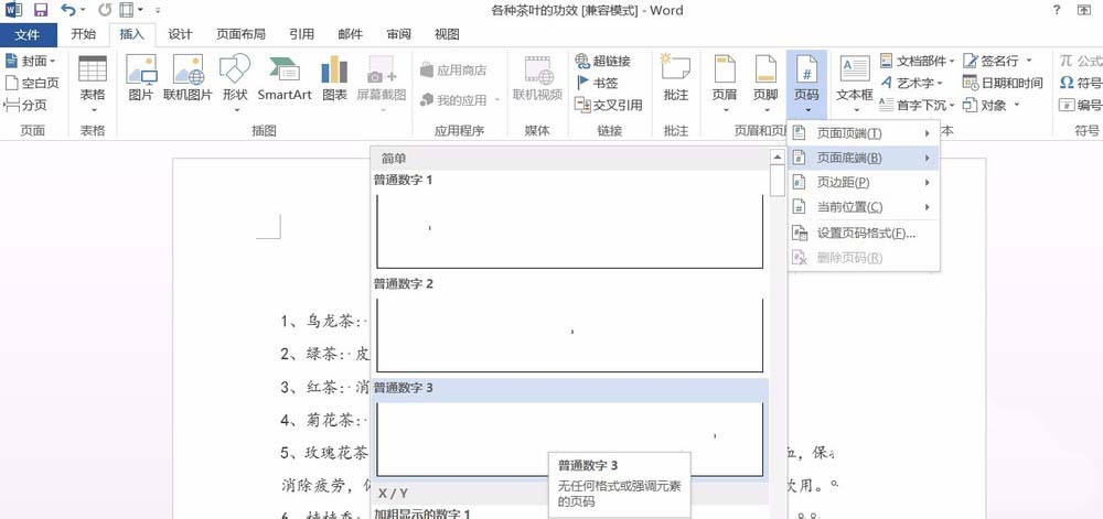 4、点左上角按钮:页码→页面底端→普通数字1。