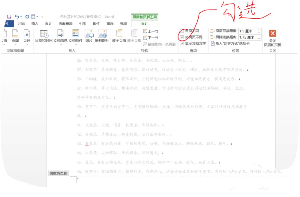 2、勾选"奇偶页不同",仔细看会发现,此时偶数页码会自动消失,不用管。