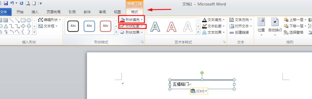 4、接着我们设置一下文本框的格式和文字大小。先选中文本框,点击上面的"绘图工具"下的"格式"。找到"形状轮廓"和"形状填充"。