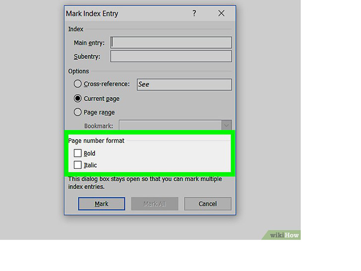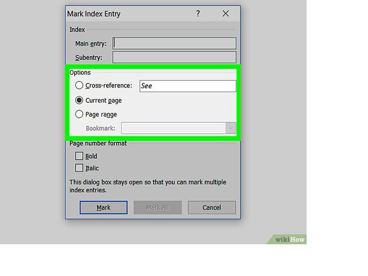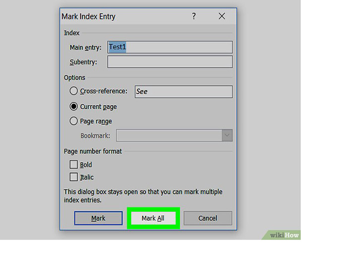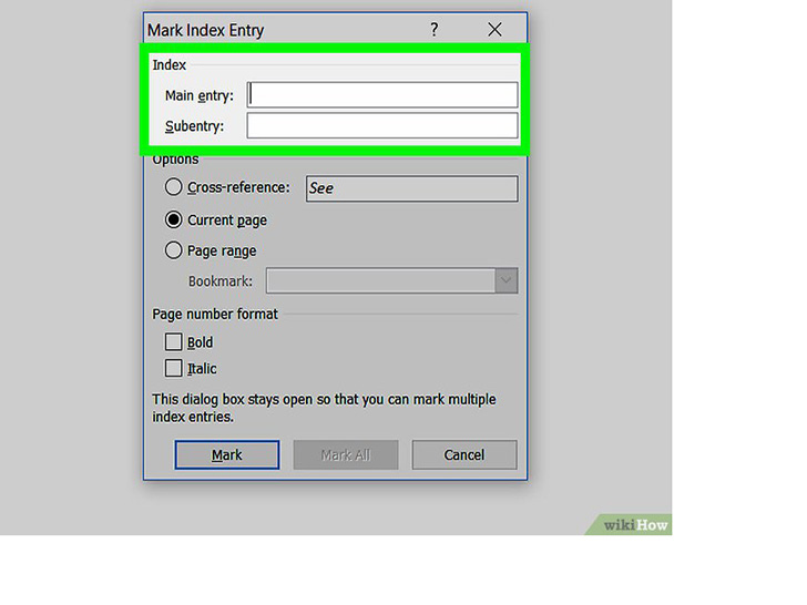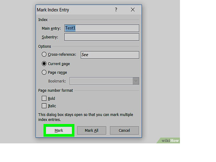 选择要标记的另一个单词或一组单词。突出显示文档中的另一个术语,并点击“标记索引项”框。新术语现在就会出现在“主索引项”字段中。你可以在“标记索引项”对话框中自定义新索引项的所有次索引项、交叉引用、页码和字体格式选项。