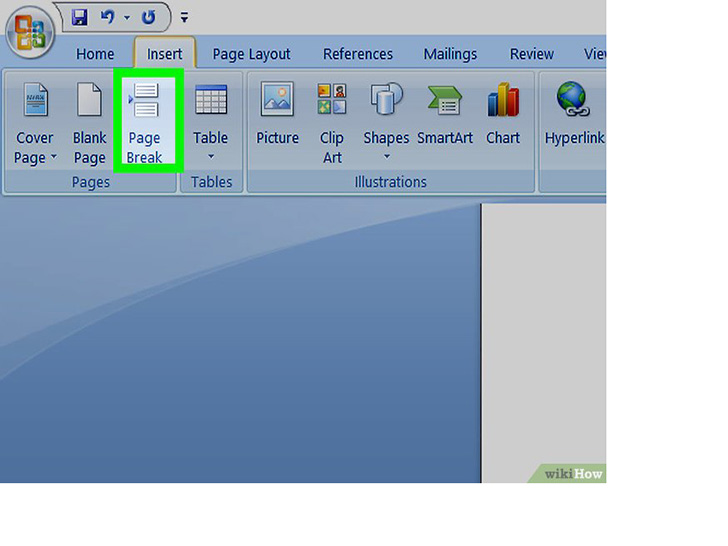 点击“插入”工具栏中的分页按钮。这个按钮看起来像一个页面的下半部分,下面还有另一个页面的上半部分。点击这个按钮会结束前一页,并开始一个新的页面。