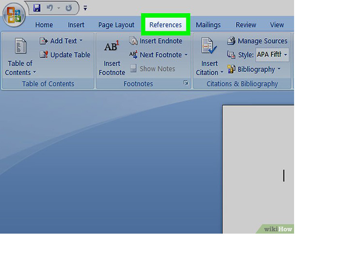 点击引用选项卡。它在屏幕顶部的MS Word工具栏上。