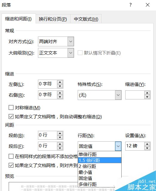 在"段落"设置页面内有"行距"一栏,单击下拉选单选中"1.5倍行距"(默认未单倍行距),当然你可以根据自己的实际需求进行设置修改,如"2倍行距",或者使用"固定值"设置自定义的行距即可,具体要根据自己Word文档的情况而定。小编在这里提醒,行距的设置尽量保证全文一致,否则看起来会非常别扭。
