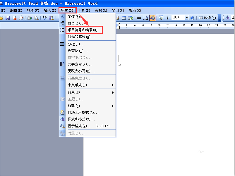 2、接着点击上边的"格式",选择"项目符号和编号"