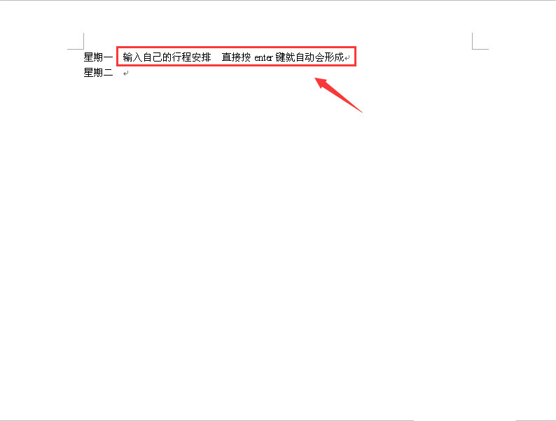 8、最后会自动显示星期一,然后输入你自己对应的行程安排,直接按enter键就会自动形成星期二 ,以此类推