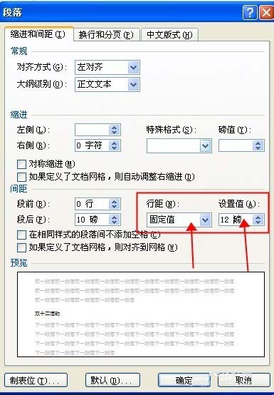 4、选择段落后在"缩进和间距"里面"行距"和"设置值"根据需要选择行距和数值,我一般都用的是单倍行距。如果是固定值,设置值一般是30.