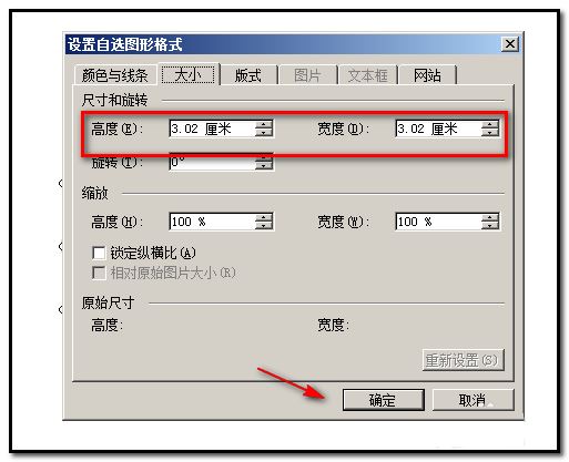 7、想要改变此圆的大小,可以双击此圆,弹出的操作框中,点开"大小"这一项,在"高度"和"宽度"分别输入数字,再点确定即可。