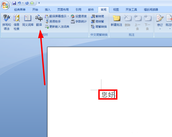 4、我们在切换到审阅之后,我们输入我们的文字,然后我们点击上边的翻译的选项卡