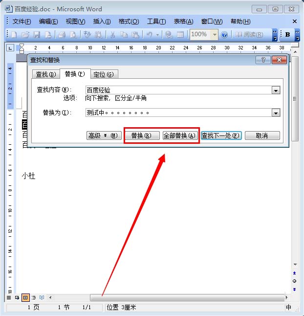 5、输入查找的内容和替换的内容之后,我们可以单独一个个的替换,也可以一次性全部替换 如图