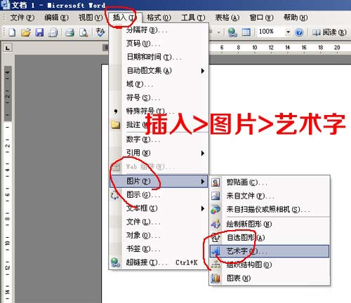 1、打开word2003,按图示操作,插入,艺术字,选第一种格式,编辑文字。