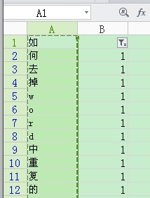 6、数据——自动筛选。只筛选出"1"(1为第一次不重复出现字,0为重复出现的字。)