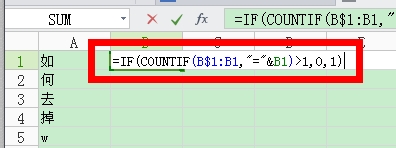 5、在B列输入:"=IF(COUNTIF(a$1:a1,"="&a1)>1,0,1)",把A列中对应的B列单元格都复制条件进来。
