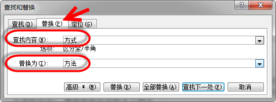 3、点击"替换"选项卡打开替换界面,在查找内容输入框中输入你要查找的错误文字,在替换输入框中输入正确的文字,比如假设我把"方法"错写成了"方式",现在要纠正过来,那么应该如下填写。