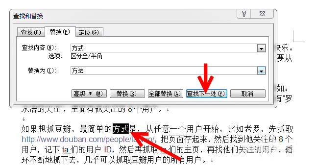 4、点击"查找下一处"按钮找到错误存在的地方,确认错误后点击"替换"按钮将错误纠正过来。